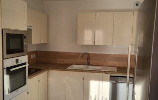 Une cuisine américaine (plein sud) avec un four, une plaque à induction, un lave-vaisselle, un four micro-ondes et un frigo-congélateur, une cafetière filtre et une cafetière Senséo
