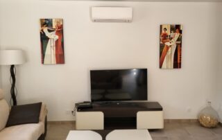 Un grand salon – salle à manger avec 2 canapés, une télévision (TNT) et un WC